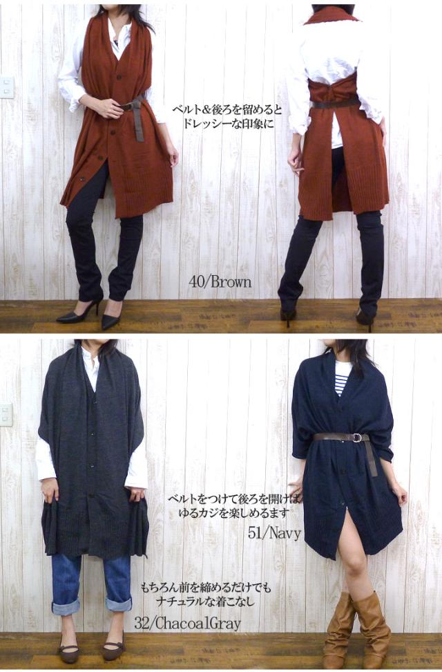 商品番号:"ah844"JohnBullからゆったりシルエットのアレンジストールの紹介です。ニット独特のちくちく感の少ないポーラムミックスという素材を使用した着心地のいいニットになっています。ボタンを留めてロングベスト風、ワンピース風、もちろんそのままストールでもよし!付属のレザーベルトをアクセントにしてもよし!これ一枚、ワードローブに加えればコーデの幅がぐんと広がりますよ。。ゆったりとしているので体型を隠しつつ、大きめのシルエットで小柄に見えることも期待できる女性のことを考えたデザインになっています。