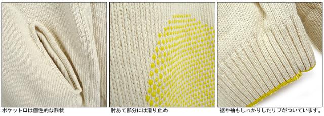 JOHNBULL【ジョンブル】ワークグローブジップフードセーター(軍手ジップフードセーター) 軍手のような手触りのニット地で作ったセーター。各メディアで絶賛された大人気シリーズの最新バージョン!手触りや風合いは、本当に柔らかい軍手の様!サラっとした、とても肌ざわりの良い着心地が魅力です。肘には、滑り止めのラバーをイメージしたディティール、袖口も軍手をイメージして、イエローのパイピングが施されています。着用モデル身長175センチ 体重58キログラム Mを着用しています。