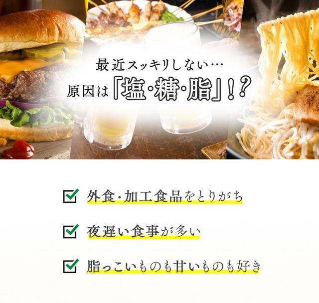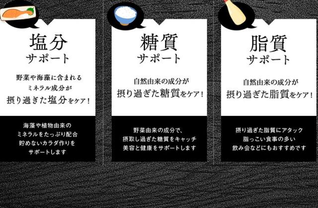 | 原材料名 | 麦芽糖(国内製造)、桑の葉粉末、褐藻抽出物、イヌリン、ヤシ殻活性炭、赤松炭、竹炭、ウーロン茶エキス、キノコキトサン、ブラックカラント抽出物、黒大豆、醗酵黒タマネギパウダー、醗酵黒ニンニクパウダー、ゴボウ末、ブロッコリースプラウトエキス、大麦若葉粉末、ケール粉末、ブロッコリー粉末、かぼちゃ粉末、チンゲン菜粉末、パセリ粉末、人参粉末、セロリ粉末、苦瓜粉末、ほうれん草粉末、モロヘイヤ粉末、よもぎ粉末、トマト粉末/結晶セルロース、酸化マグネシウム、塩化カリウム、ヒドロキシプロピルセルロース、ショ糖脂肪酸エステル、微粒二酸化ケイ素、ステアリン酸カルシウム 【栄養成分表示 3粒(1.11g)あたり】エネルギー 2.97kcal、たんぱく質 0.32g、脂質 0.04g、炭水化物 0.79g(糖質0.46g、食物繊維0.33g)、食塩相当量 0.002g |