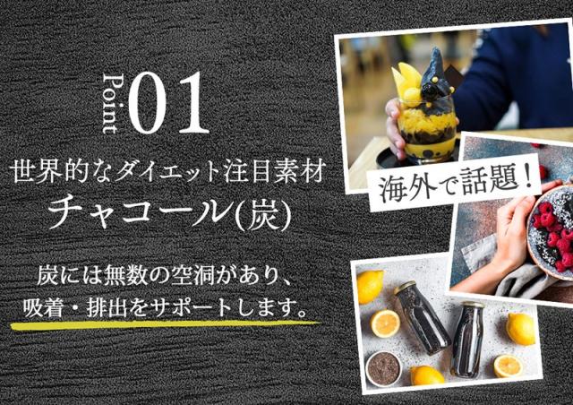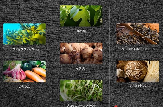 麦芽糖(国内製造)、桑の葉粉末、褐藻抽出物、イヌリン、ヤシ殻活性炭、赤松炭、竹炭、ウーロン茶エキス、キノコキトサン、ブラックカラント抽出物、黒大豆、醗酵黒タマネギパウダー、醗酵黒ニンニクパウダー、ゴボウ末、ブロッコリースプラウトエキス...他