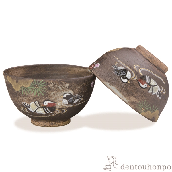 仲睦まじい鴛鴦のつがいが黒灰釉に映えて、格調高い仕上がりです。ご夫婦への慶事の贈り物に最適な飯碗です。