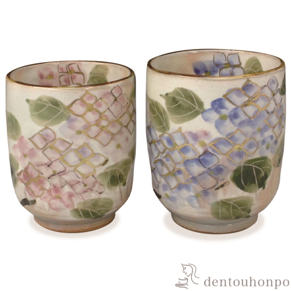 乾山調の味わい深い生地に紫陽花を描きました。優しい色調で趣のある湯呑です。