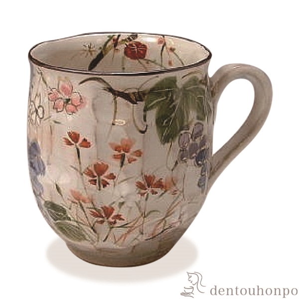彫を施した生地に、四季に咲く五草花を描きました。季節を問わずお使いいただける、味わい深いマグカップです。