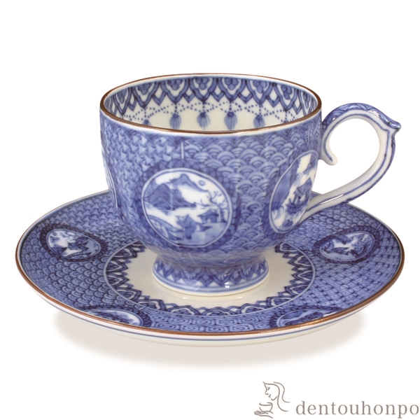 染付で細かく描かれた古紋が美しい器です。丸紋には山水図が描かれ空間の広がりを感じさせてくれます。