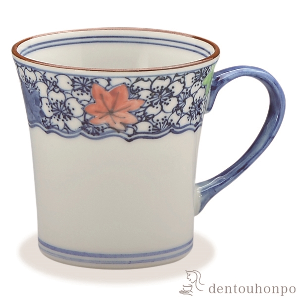染付で描いた桜が美しいマグカップです。ところどころに散りばめられた紅葉は色彩を帯び、華やかさを演出しています。