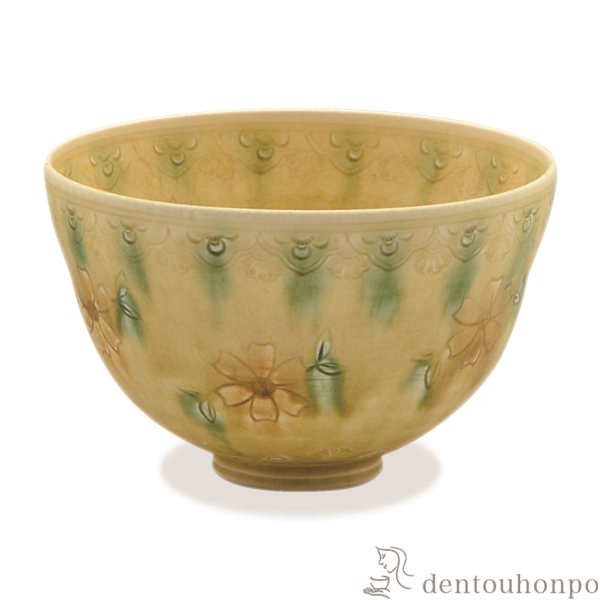味わい深い黄瀬戸釉に印華を施した抹茶碗です。印華の花や模様の部分には緑や茶色でアクセントを付けています。