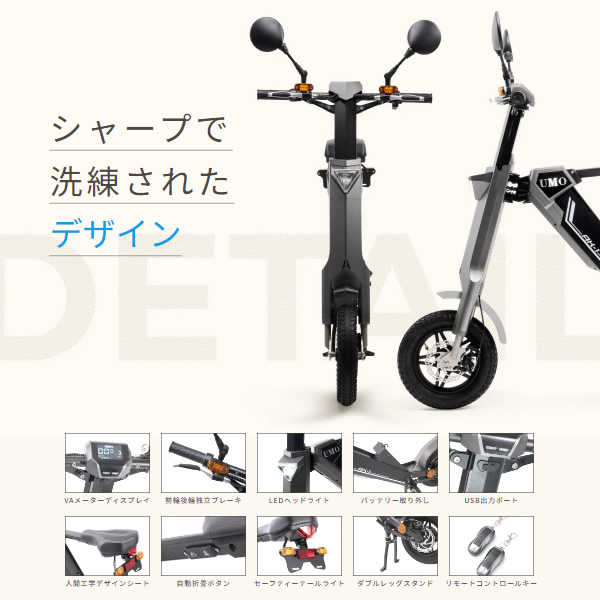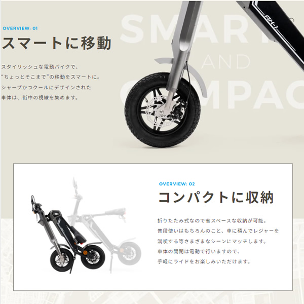 AK-1 / 折り畳み電動バイク 完全電気で稼動する電動バイク。 ナンバープレート取得で公道も走行OK! ※交通法規に従い、ヘルメットの着用と免許証の携帯は忘れずに。 ■カラー: パープル ■モーター定格電圧:48V ■モーター定格出力:350W ■本体重量:22.5kg ■速度目安(人が乗っていない状態):1段20km/h、2段25km/h、3段30km/h ■走行距離(人が乗った状態):約20〜25km ■車体重量:22.5kg ■耐荷重量:120kg ■充電時間:3〜4時間 ■バッテリー(取り外し可能):リチウムイオンバッテリー ■ブレーキ:ディスク+E-ABS ■防水等級:IPX4 ■展開サイズ:1244mm×612mm×1095mm(サイドミラー含まず) ■折畳サイズ:895mm×312mm×967mm(サイドミラー含まず) ■タイヤサイズ:12inc ※記載は商品仕様の一部です。仕様説明不足等の理由での返品はできません。特に適合等は必ずご確認ください。