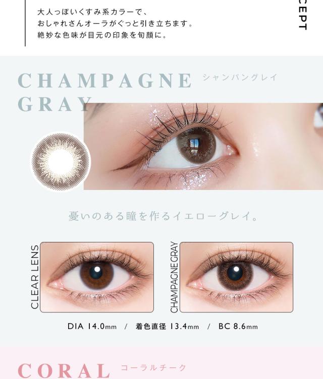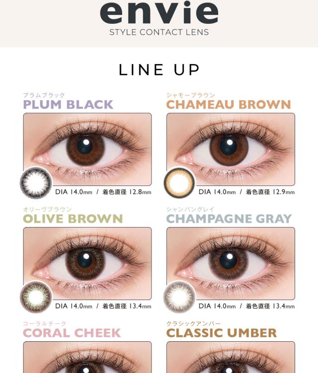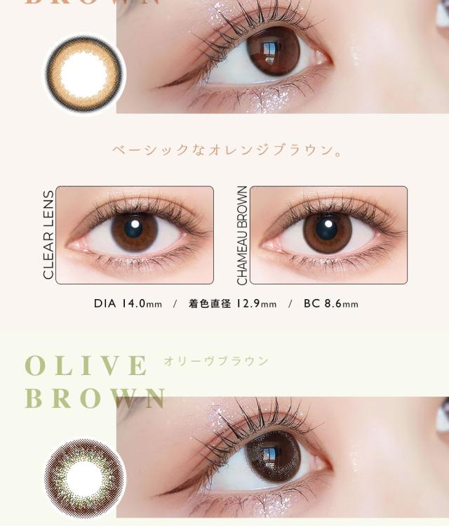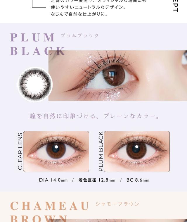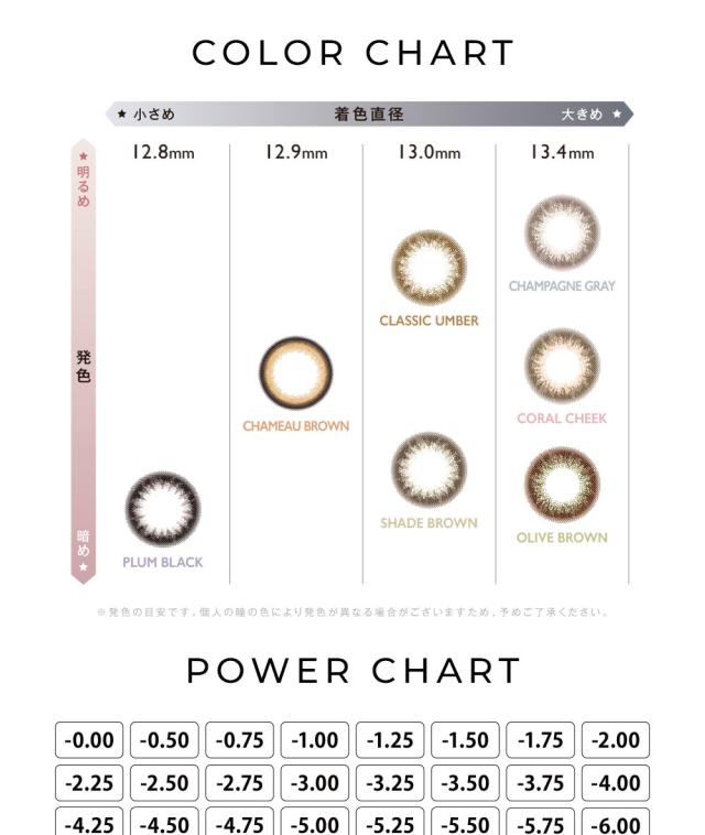 | ◆スペック◆ | 直径(DIA):14.0mm ベースカーブ(BC):8.6mm 着色直径: プラムブラック 12.8mm シャモーブラウン 12.9mm クラシックアンバー、シェードブラウン 13.0mm コーラルチーク,シャンパングレイ,オリーヴブラウン 13.4mm |