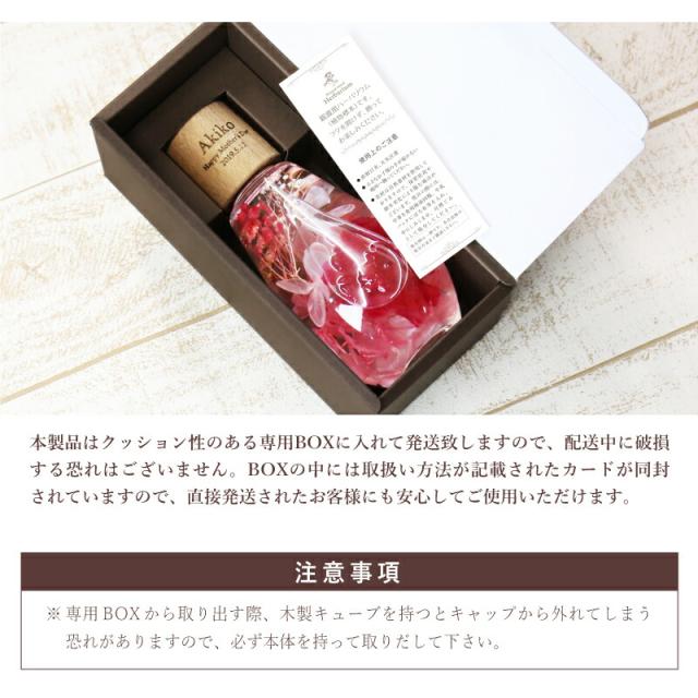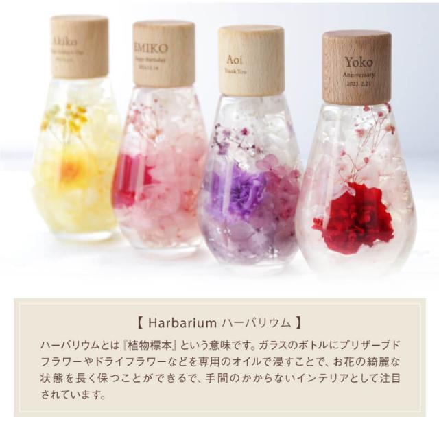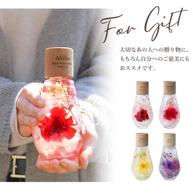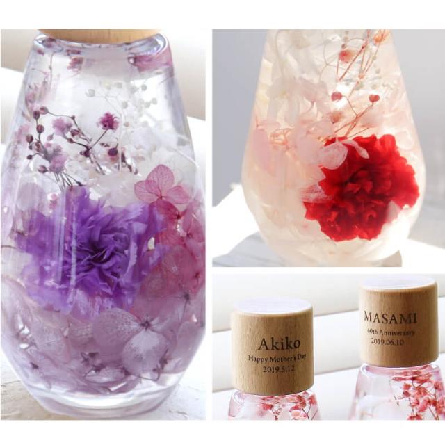 - 名前も入れられる事、程よい大きさが決め手になって購入しました! 今までのプレゼントの中で1番ステキ、と母が大変気に入ってくれました! 実物を見ましたがお花もとてもキレイでした。 配送の際にお花が回ってしまい名前の方向に向かない可能性がある、とお手紙が入っていましたが、老眼の母は気付かず。。 花ではなくコルクをキツつ回して直してしまったそうです。 コルクは壊れてないから大丈夫かな? 先に私が説明すれば良かったとそこだけ後悔しました。 お品物には大変満足です! ステキな物をありがとうございました!