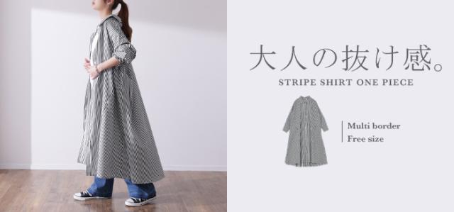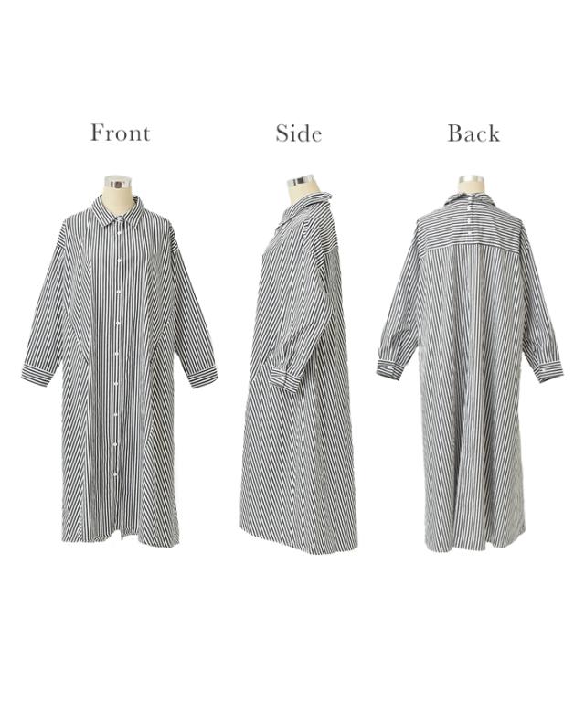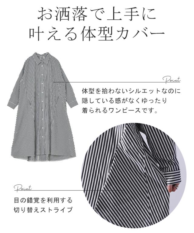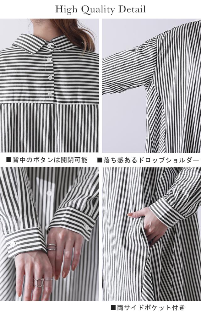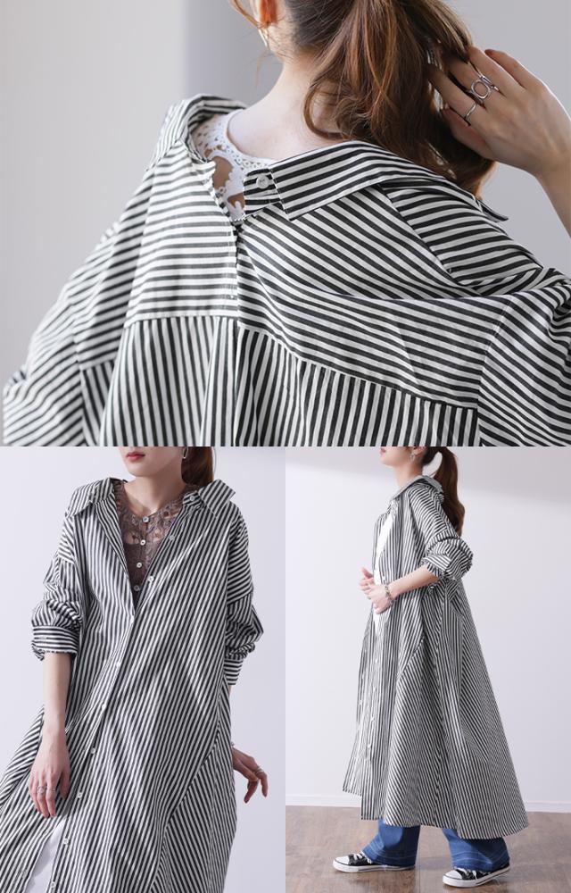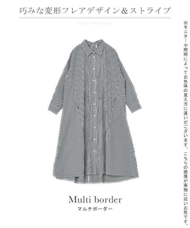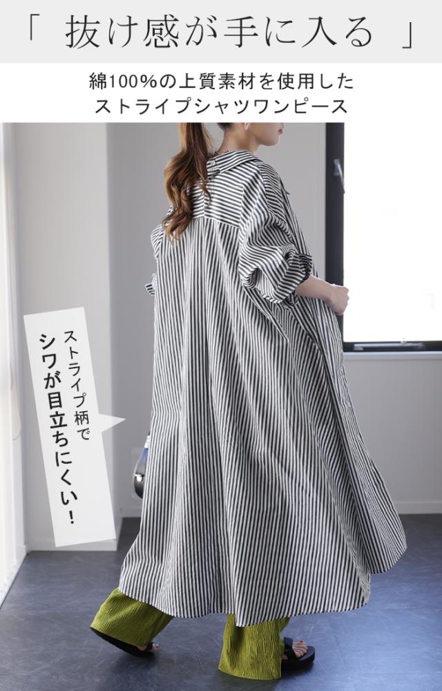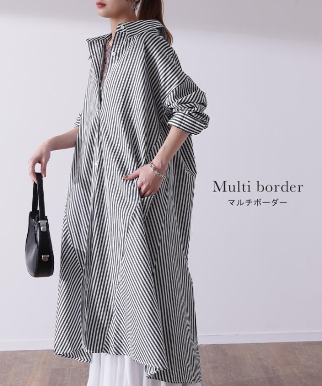 ワンピース ロングワンピース マキシ丈 マキシワンピース コットン100% ストライプ シャツワンピース シャツワンピ シャツ 抜き襟 細ストライプ マルチボーダー アシンメトリー ロング 長袖 大きいサイズ 冬 秋 秋新作