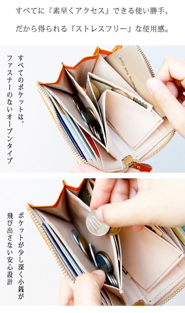 すべてのポケットにはファスナーがないオープンタイプで小銭やカードへ素早くアクセスできる時短設計。