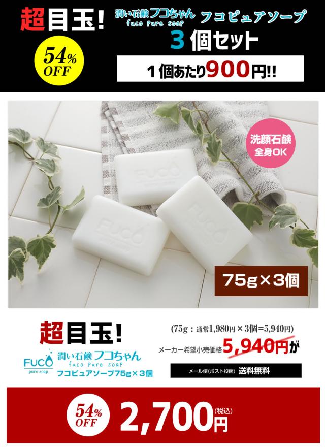 ※超目玉※\54%OFF!!/★超割引2,700円★【フコピュアソープ(潤い石鹸フコちゃん)×3個セット】!!【メール便】送料無料 2セットでもう1個プレゼント♪洗顔 石鹸 毛穴 黒ずみ ニキビ予防 角質 角栓除去 イチゴ鼻 花粉