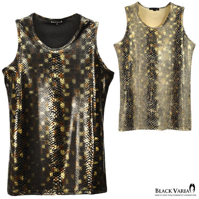 メール便可/1枚まで タンクトップ パイソン 蛇 光沢 メンズ 総柄 日本製 ストレッチ 細身 スリム mens(ブラック黒ゴールド金) 193200
