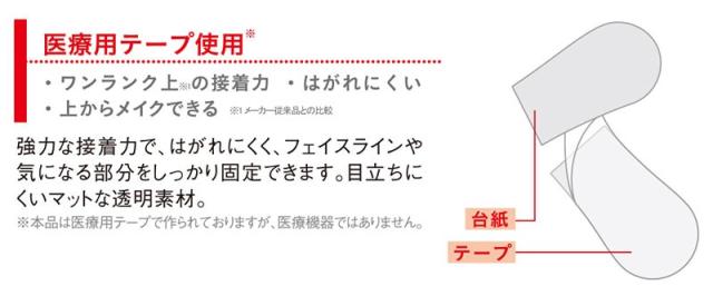 | 商品説明 | 強力な接着力で、はがれにくく、フェイスラインや気になる部分をしっかり固定できます。 目立ちにくいマットな透明素材。 |