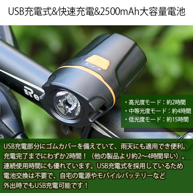 USB充電式を採用しているため電池交換は不要で、自宅の電源やモバイルバッテリーなど外出時でもUSB充電可能です! 高輝度の白色T6-LED電球の出力1200ルーメン