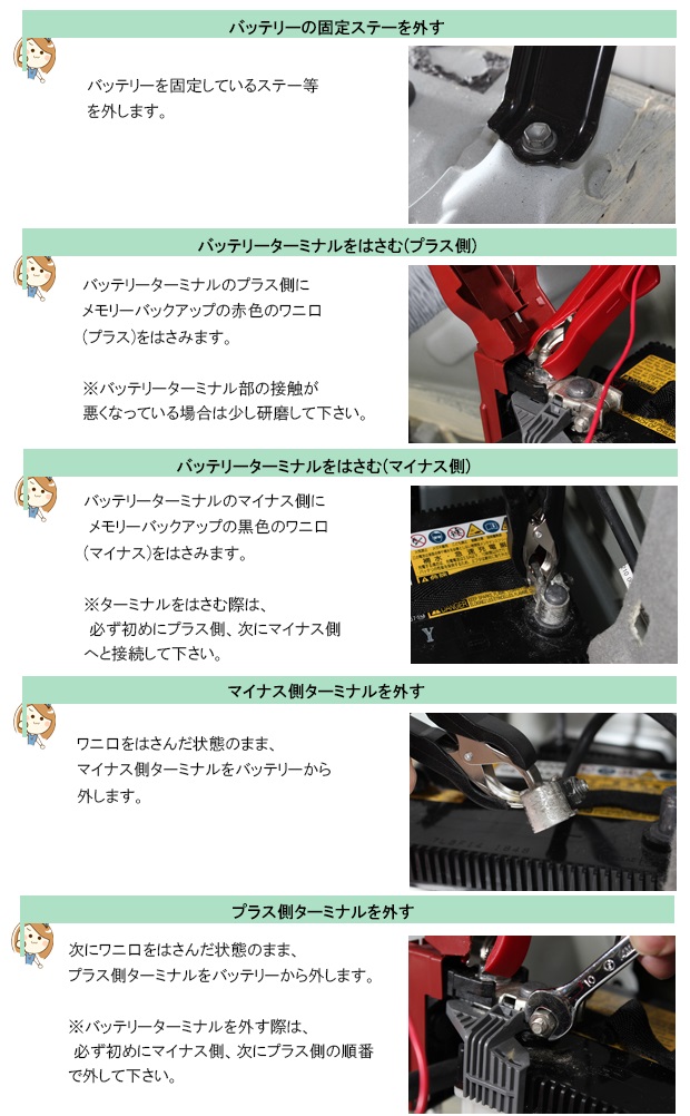 .商品概要 バッテリー交換時、バッテリーを外すと時計やオーディオ・ナビゲーションの設定コンピューター等がリセットされる場合があります。その際に便利なアイテムがITEM No.8864 メモリーバックアップ。 車両に一時的にバッテリーの代わりとして電源を供給し、車のメモリー保護を行います。 ※一部の純正ターミナルや市販品パーツを取り付けたターミナルには使用できない場合があります。※輸入車には使用できない場合があります。 ▓ No.8864 メモリーバックアップ