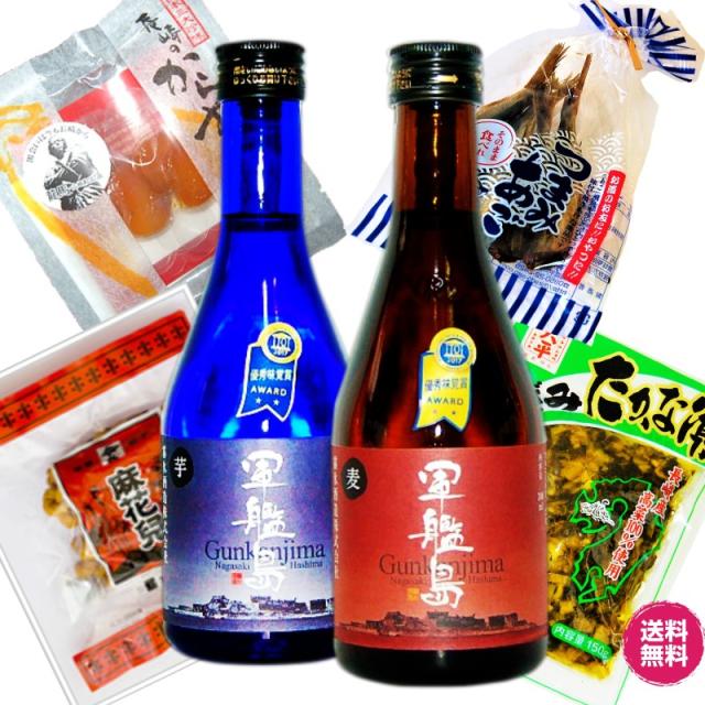 長崎酒つまみセット 軍艦島芋焼酎300ml・軍艦島麦焼酎300mlからすみ・あご・高菜漬・マファール 送料無料一部地域を除く