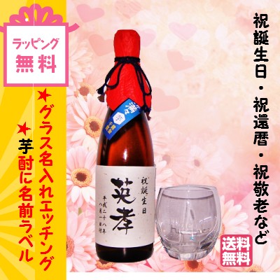 祝に心に残る贈り物をぜひどうぞ!焼酎にお誕生祝ラベルを貼り、ロックグラスに名前をエッチングします。
