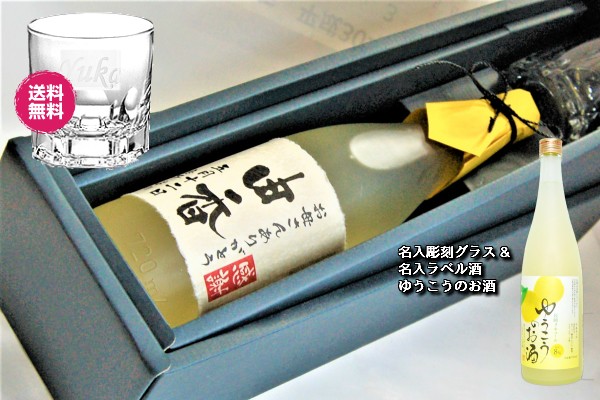 名入彫刻ロックグラス&名入ボトルラベル酒(長崎柑橘ゆうこうのお酒720ml)誕生日 母の日 就職 退職 還暦祝い 送料無料 一部地域除