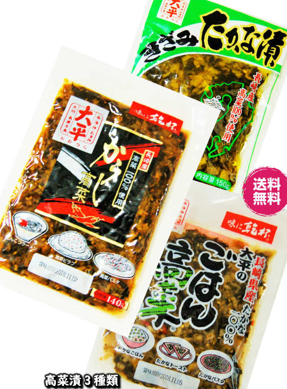 高菜漬3つの味 長崎産お漬物 きざみ高菜 からし高菜 ごはん高菜/3個大平食品 メール便(ポスト投函)でお届けいたします。メール便のためクール・配送指定日・時間指定・代引き不可 おためし