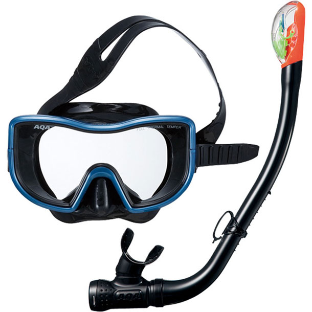 広い視界のワイドレスマスクに、水の侵入を防ぐドライトップスノーケルをセット。男性向けサイズ