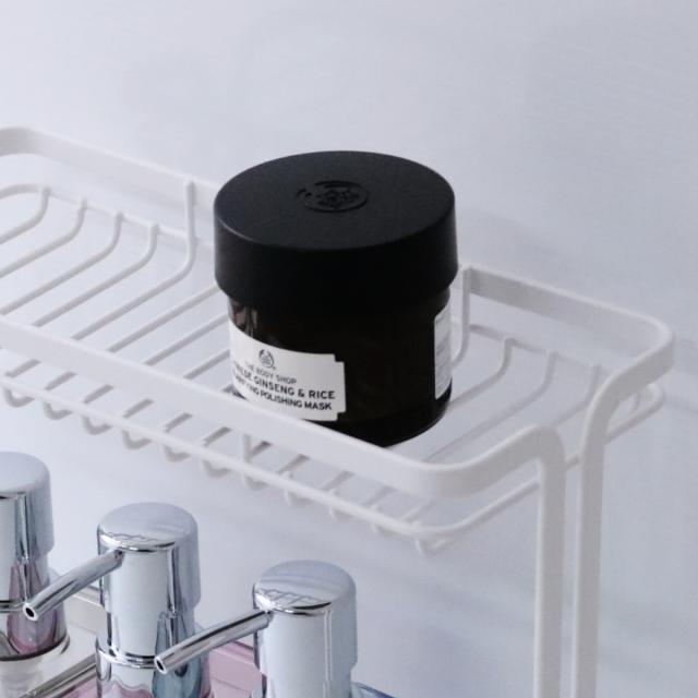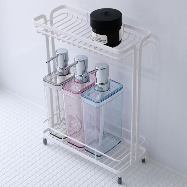 2段タイプはバスグッズをまとめて収納できるので、夫婦や家族用にオススメです。ディスペンサーなどの底の通気性が良くなるので、イヤなヌメリを防ぎます。お掃除の時も、ラックごと移動できるので便利です。