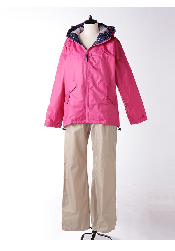 すっきりシルエットでスタイルアップ!レインスーツなのに、デイリーに使えるオシャレなデザイン。ウエスト部分に少し絞りを入れ、ダボつかずすっきりしたシルエット。ジャケットとパンツがセットになったレインスーツ。雨を防ぎ、視界を確保するフード。内側のドット柄もかわいい。3Dカッティングで運動性抜群!腕の上げ下げも楽々です。裏地には防水シームテープが貼ってあり、水の浸入を防ぎます。信頼と安心の防水素材、TPUラミネートを採用。総裏メッシュなのでべたつきを防ぎます。別売りのレインバイザーをフードに取り付けることができます。ややタイトに作られておりますので、重ね着なさりたい方はワンサイズ大きいサイズをお選びください。