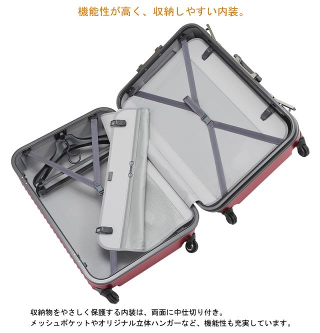 10泊程度の長期の旅行にもたえうる大容量を誇る、フレームタイプのスーツケース。たっぷりの容量は、帰りにお土産などの荷物が増えても安心。家族の荷物をひとまとめにしたい小さなお子様のいるご家庭や、ホームステイにも人気のサイズです。サイズ制限は心配だけど、もっと入るスーツケースをお探しの方に、預け入れ手荷物国際基準サイズ(縦+横+高さ=157cm)をクリアするサイズで開発しました。ボディには細かなリブと砂目シボ加工を施し、キズが汚れの目立ちにくさも特徴です。デザイン性と機能性を兼ねそなえた日本製スーツケースです。