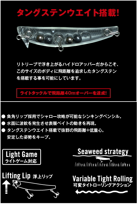 メバルを中心にクロダイなどのライトゲームやマイクロベイトパターンのシーバスゲームに。巻くと浮き上がる浮上設計で、ウィードやゴロタ周辺に潜むターゲットにも積極的にアプローチ。表層引き波のティザー効果を発揮し、フィッシュイーターへ強烈にアピール。巻いて寄せる、止めて食わせるなど様々なパターンを楽しめる。シミーフォールでも緩やかにロールを発動しバイトのチャンスを拡大。ジグヘッドリグやフローティングミノーでは攻略が難しい沖の表層攻略にも。