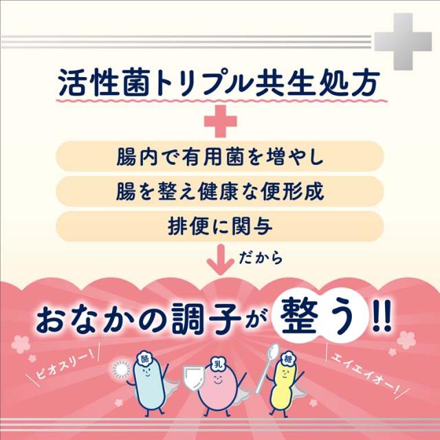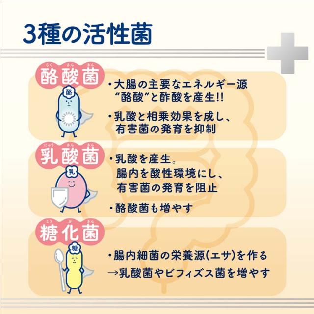 ●ビオスリーは小腸から大腸の部位ごとに働く3つの活性菌(「酪酸菌」、「乳酸菌」、「糖化菌」)を配合しています。