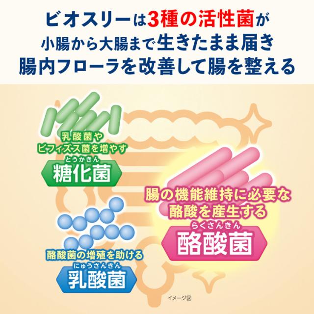●ビオスリーは小腸から大腸の部位ごとに働く3つの活性菌(「酪酸菌」、「乳酸菌」、「糖化菌」)を配合しています。