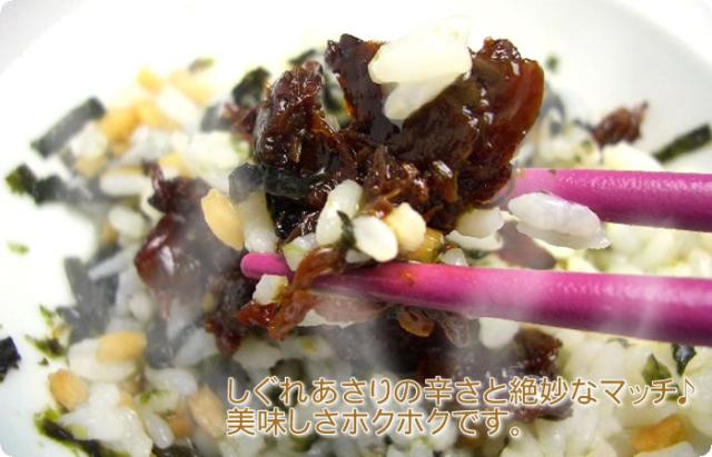 | あっさり辛さが最高な自慢したくなる味です。これぞ!あさり茶漬けの出来上がり♪ 止められない!美味しさがここにあります。食べだすとついつい食べてしまう組み合わせです。 |