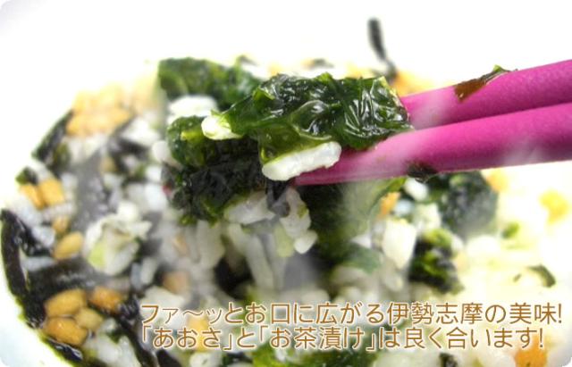 これだけで伊勢志摩の磯の香りタップリ♪カルシウム満点!海の栄養素満点!最強のあおさ茶漬けの出来上がり♪ 『あおさ』って知ってますか? 日本で数ヶ所しか採れない、しかも伊勢志摩地方が一番良質の『あおさ』の産地って知ってますか?リアス式海岸が生み出す伊勢志摩の特産物なのです。全国生産量の7割が三重県であります。 |