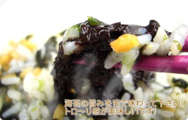 | 海苔の本来の香りがお鼻をくすぐらせ、お口の中では、舌から感じる最高の旨味!本物の黒のり茶漬けの出来上がりです。 本来の旨味を味わう為に自然そのままに残しました風味豊かな健康食材でございます。 |