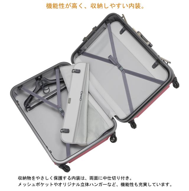1週間程度の旅行や出張に適したサイズの、フレームタイプのスーツケース。比較的どの日数のご旅行にも使い勝手が良いのでスーツケースの基本のサイズとしておすすめで、初めてスーツケースを購入される方にも人気です。ボディには細かなリブと砂目シボ加工を施し、キズが汚れの目立ちにくさも特徴です。キャスターには体感音量を大幅に軽減した独自開発の「サイレントキャスター」に加え、走行時の軽快な滑り出しを実感できる「ベアロンホイール」を採用。静かで軽やかな走りを可能にします。デザイン性と機能性を兼ねそなえた日本製スーツケースです。