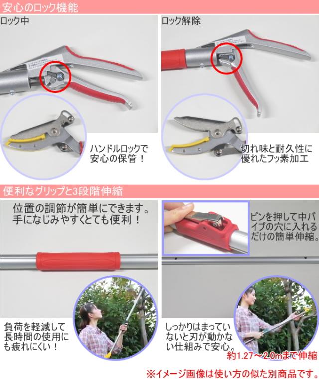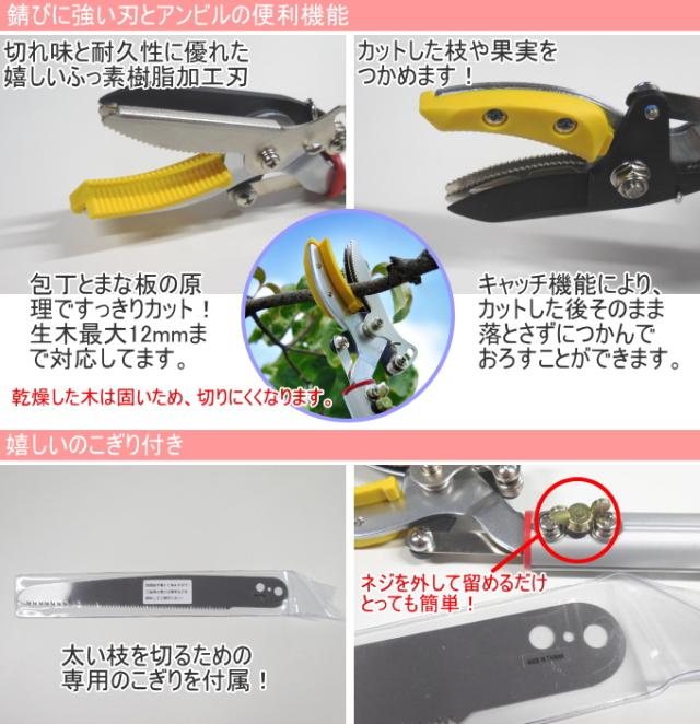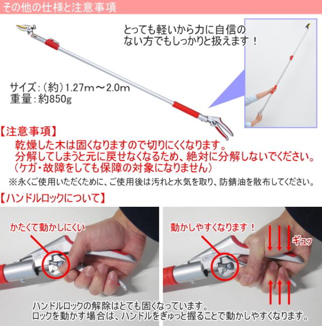 | 材質 | ポール部:アルミパイプ 切刃:SK-S材(フッ素樹脂加工) アンビル(受部)・グリップ:プラスチック ハンドル:アルミダイキャスト キャッチ部:S-50C(メッキ仕上) ノコギリ:刃物鋼 |