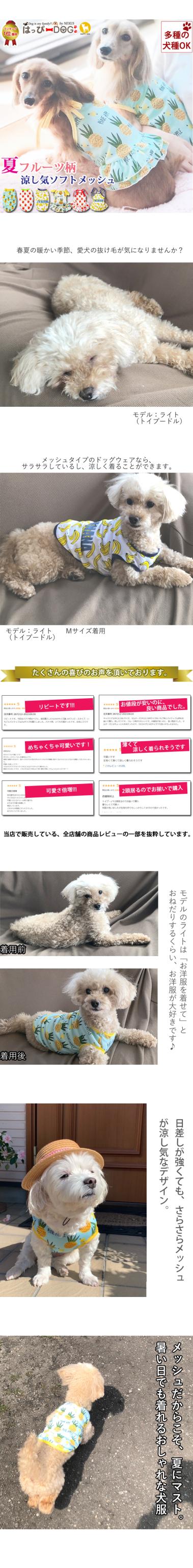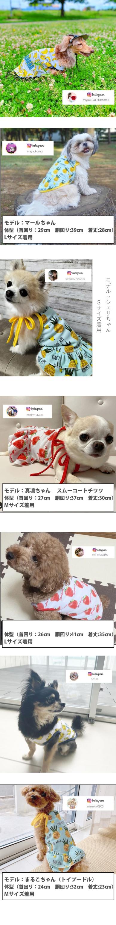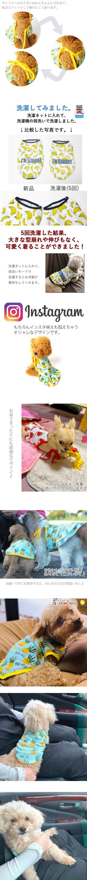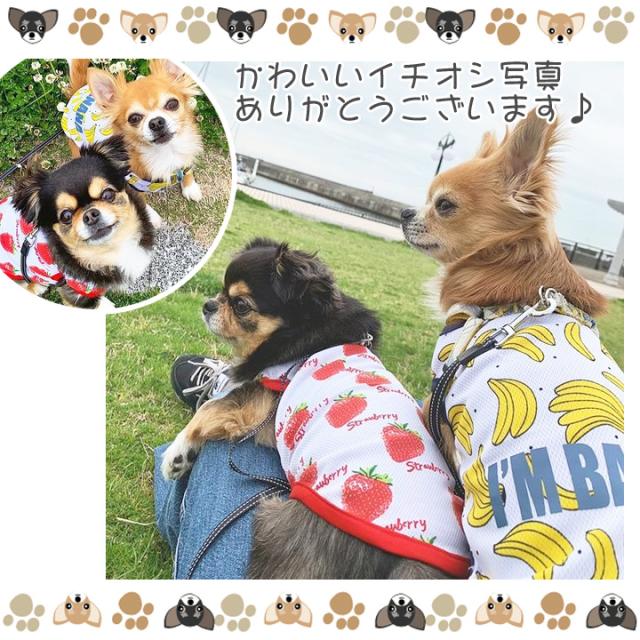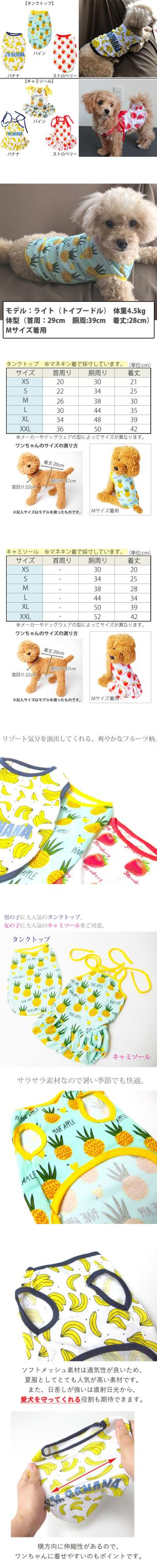 女の子にはキャミソール・男の子にはタンクトップがおすすめです☆袖なしのデザインなので、お洋服を嫌がるわんちゃんでも比較的、簡単に着せやすいです♪小型犬・中型犬用にサイズはXS、S、M、L、XL、XXLをご用意しました!カラーはパイン、ストロベリー、バナナの3種類をご用意しました♪