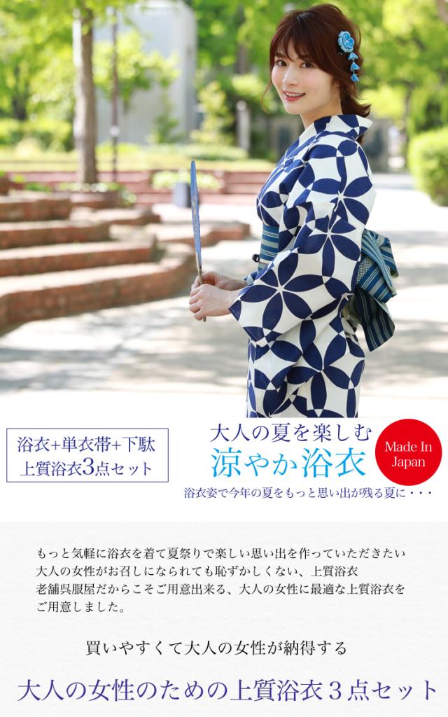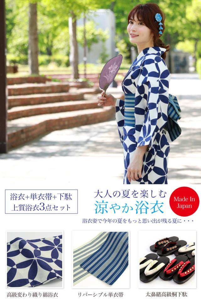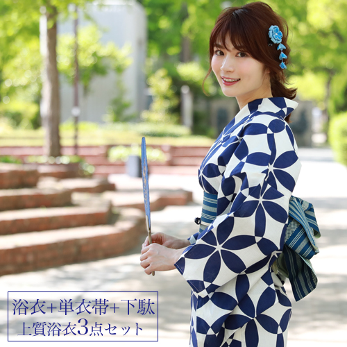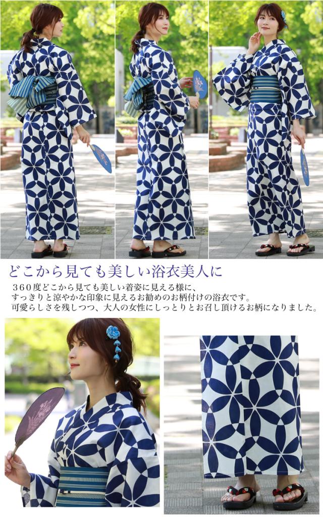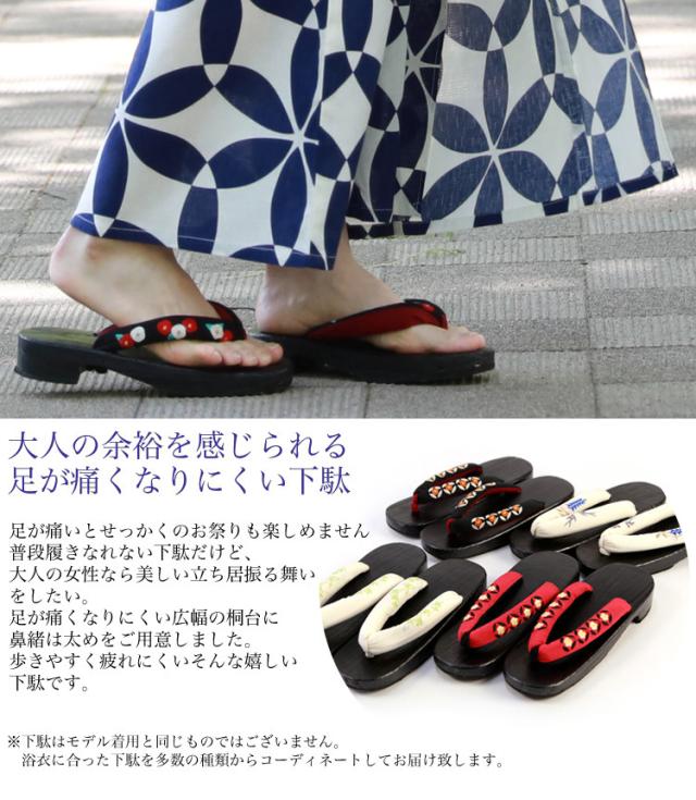 | 備考 | ※浴衣の柄の配置はモデル着用とまったく同じではございません。予めご了承下さいませ。 ※下駄は当店がコーディネートしてお選びさせて頂きます。 ※日本製生地日本製染め・縫製中国 | |||
