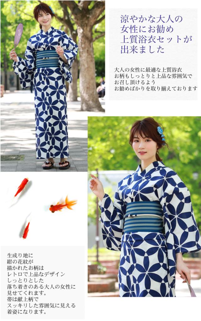 浴衣 セット レトロ 大人 レトロモダン 高級変わり織り綿浴衣3点セット「生成り地に紺の花紋」 浴衣 紺 レディース
