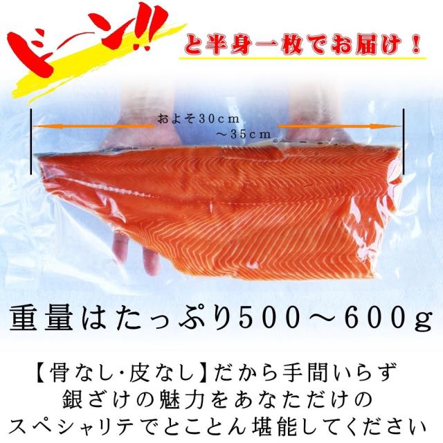 【4/5までクーポンで2,000円OFF】骨なし 皮なし あとは切るだけ hsk 宮城県産お刺身用金華銀ざけ たっぷり半身一枚 安心と安全の純国産サーモン 女川産 しゃけ ギンザケ 銀鮭 サケ 金華銀 金華銀鮭 送料無料 冷凍便
