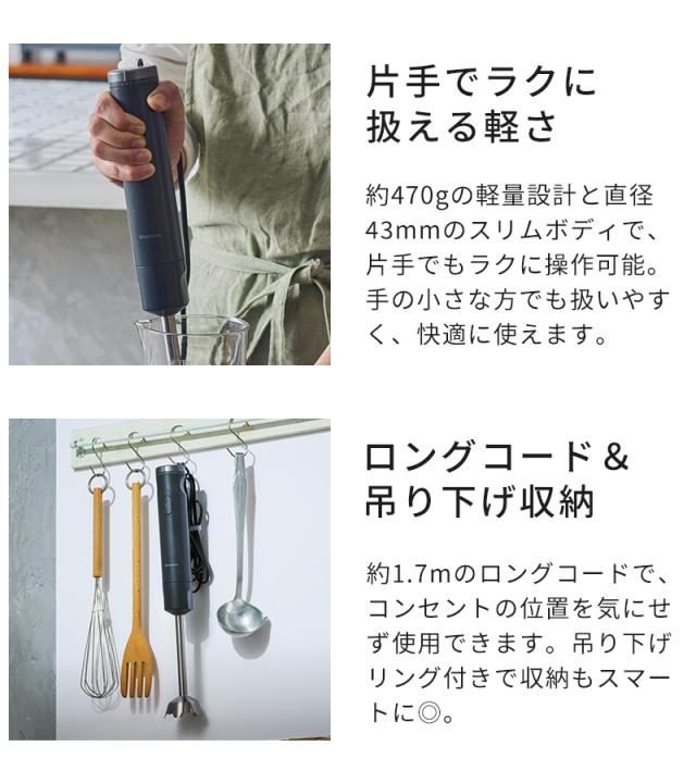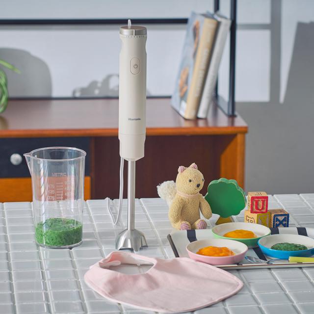 軽くてスリムなボディに、パワフルなかくはん性能を備えた「ビタントニオ ハンドブレンダー VHB-30」。1台で「つぶす」「混ぜる」「泡立てる」「刻む」「おろす」をこなし、多彩な調理をサポートします。8段階のスピード調節ができるので、食材や仕上がりに合わせて細やかな調整が可能。赤ちゃんの離乳食づくりにもぴったりです。分解して洗える衛生的な設計と、アタッチメントをまとめて収納できる専用ケース付きで、毎日使いたくなる使い心地です。