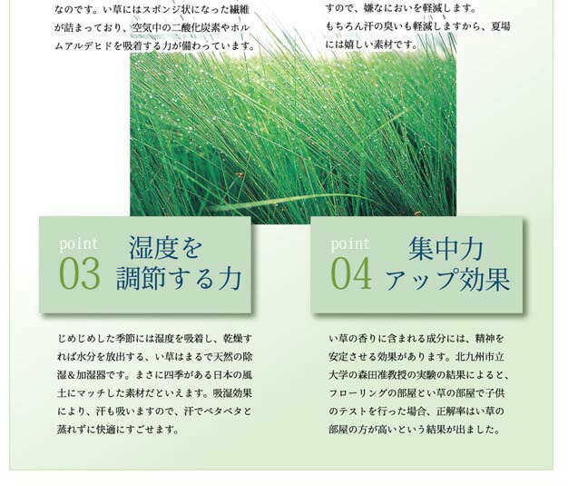 い草には空気の清浄化作用、湿度の調節作用があり、汚れにくいといった特徴があります。