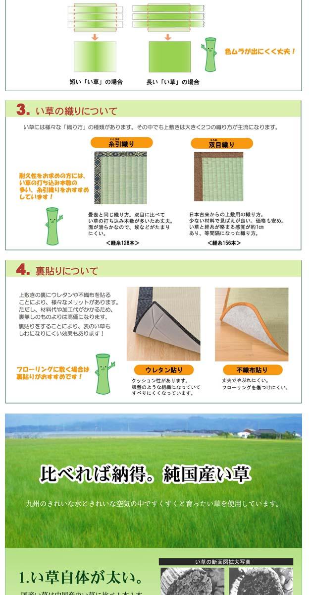 国産い草は一本一本が太く、表皮が厚く繊維がキメ細かいので弾力性があり、耐久性に優れています。