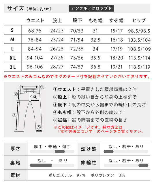 | アンクル・サイズ | ウエスト | 股上 | 股下 | もも幅 | 裾幅 | ヒップ |