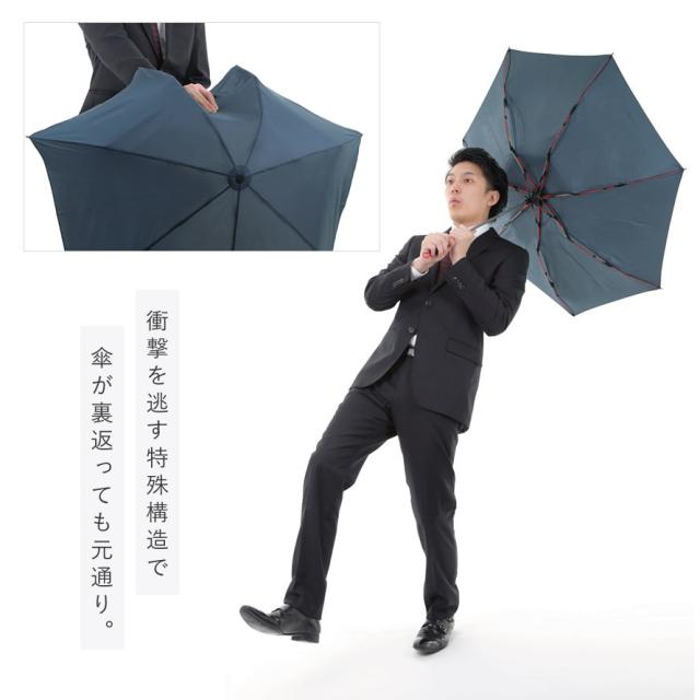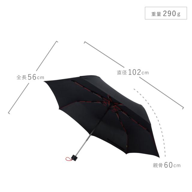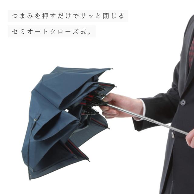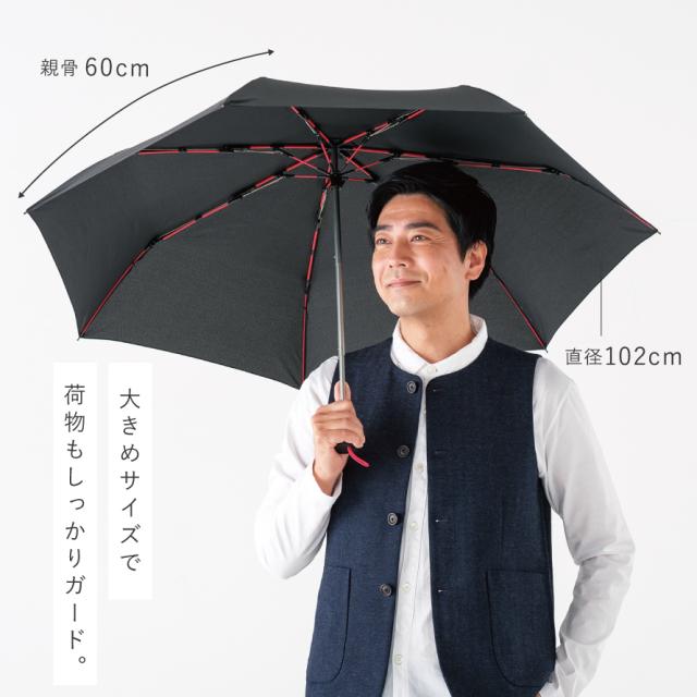 太めのグラスファイバー製骨と高耐久性樹脂パーツを採用し、一般的な折りたたみ傘に比べ、強風や突風に耐える壊れにくい構造を実現。つまみを押すだけでサッと閉じるセミオートクローズ式です。傘を開けた時にちらりと見える骨やストラップの赤色で、強さを表現。