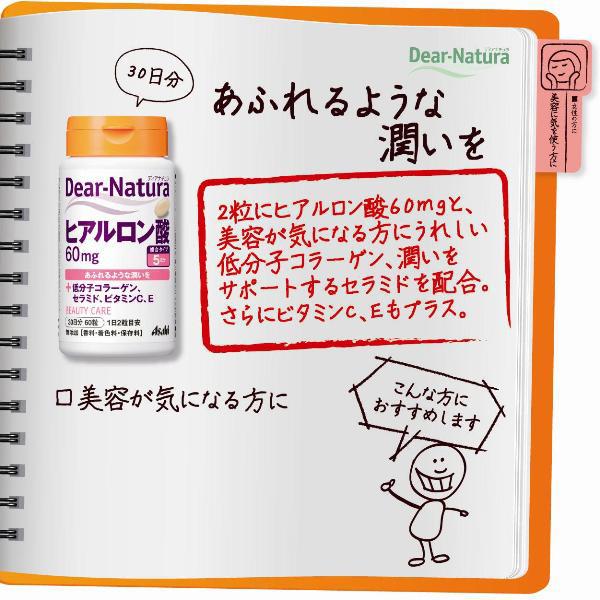 ●2粒に、「ヒアルロン酸」を60mg配合。 さらに、 美容に役立つ低分子コラーゲ ン、セラミド、ビタミンC、ビタミンEをプラス。 みずみずしい毎日を応援します。