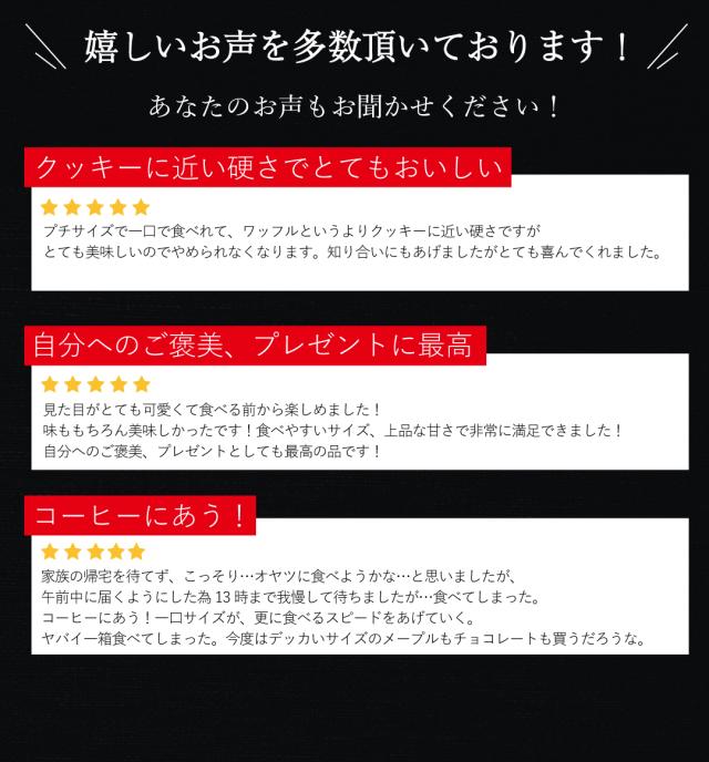 - プレゼント用に購入しました。量がしっかり入っていて、一口サイズなワッフルが可愛くて、喜んでもらえました!
