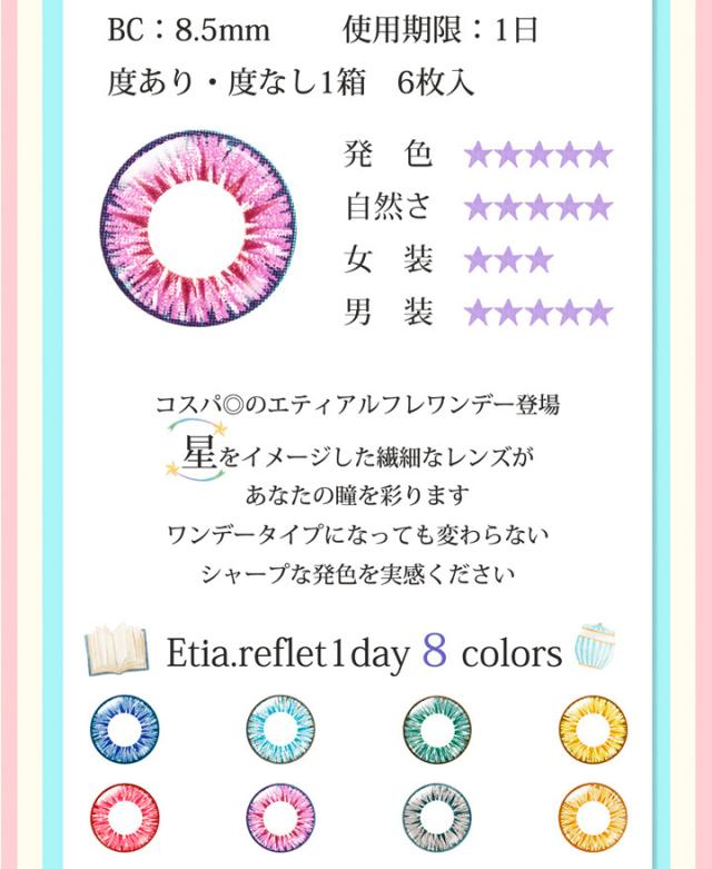 カラコン エティア ルフレ ワンデー 1箱6枚入(送料無料)度あり 度なし 14.5mm Etia reflet 1day ハーフ目 コスプレ 高発色 白 赤 紫 緑 黄 big_bc