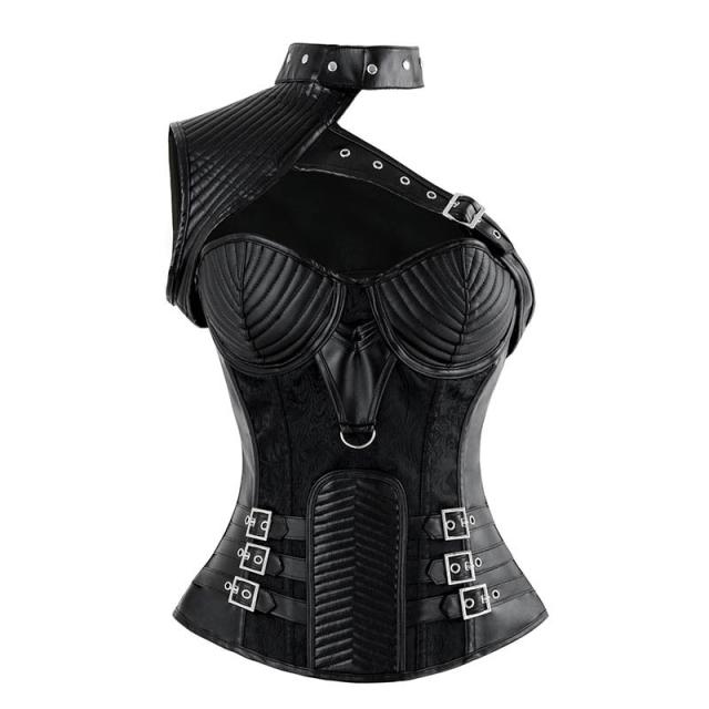 黒色のフェイクレザー製の前がバックル後ろがレースアップになったブラックコルセットとレザー肩当てをセットにした甲冑のようなボンデージファッションに最適のアイテムです。
