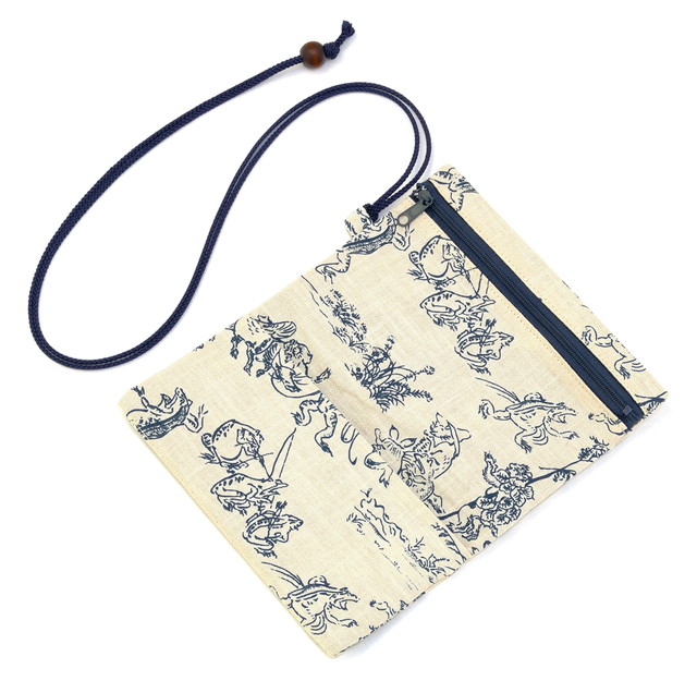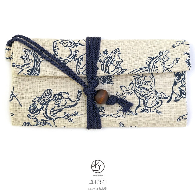 道中財布 生成り オフホワイト 紺 ネイビー 鳥獣戯画 ウサギ カエル 和柄 綿 ひも付き 巾着 メンズ 男物 浴衣向け 着物向け オールシーズン 日本製 メール便対応